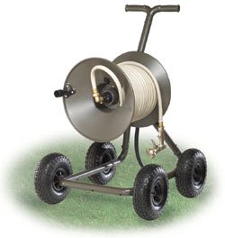 The Rapid Reel 225-foot four-wheel wagon reel provides an organized means to efficiently store and transport hoses up to 225 feet long. Features include four rugged 10-inch pneumatic wheels designed to roll over a variety of different terrain, and a rugged tubular frame for maximum stability. A great alternative to wall-mounted reels, the reel is elevated for comfortable rewinding, and comes with a dual grip handlebar for added user comfort. The included bass swivel comes backed with a 10-year limited warranty. No hose is included.