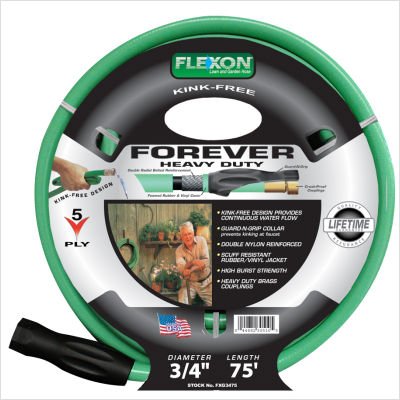 FLXFXG3475 Features: -Forever plus garden hose. -Features flex-guard collar. -Scuff resistant rubber/vinyl jacket. -High burst strength. -Double nylon-reinforced. -Heavy-duty crush proof solid brass couplings. -Lifetime guarantee. -Dimensions: 0.75'' W x 75'' D.
