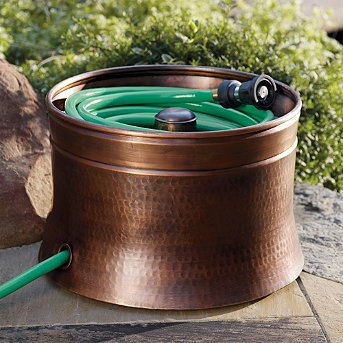 Tuck your watering hose away in our gorgeous Copper Hose Cauldron that looks more like a lovely garden embellishment than functional hose holder. Hammered by hand in a traditional Turkish cauldron design, the copper pot conceals a garden hose inside, and will add character to your outdoor environment. Hand-applied antique finish ages beautifully over time. Wraps neatly around a copper interior post. Includes 4 drain holes. Side exit hole allows for easy connection to a spigot.